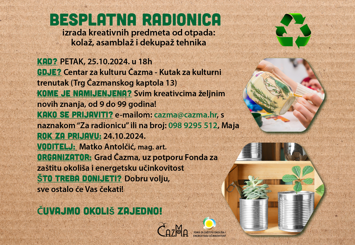 U petak, 25.10.2024., u 18 sati, u Centru za kulturu u Čazmi održat će se besplatna radionica izrade kreativnih predmeta od otpada u kolaž, asamblaž i dekupaž tehnikama.